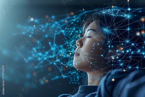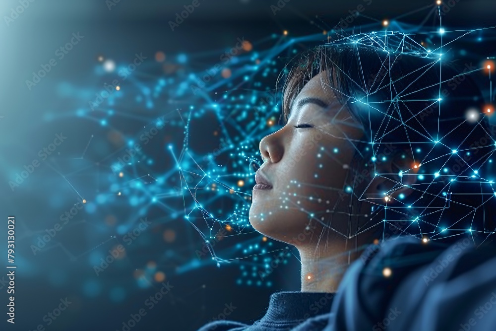 The watermark will not be included on Wall mural.: Woman sleeps on mattress with glowing white patterns, advanced technology for rest and relaxation