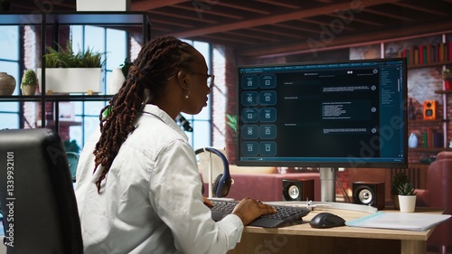Wall mural woman solving personal tasks with ai llm chatbot answering prompts using predictive technology. pers - Wall murals Wall mural woman solving personal tasks with ai llm chatbot answering prompts using predictive technology. pers - Wall murals