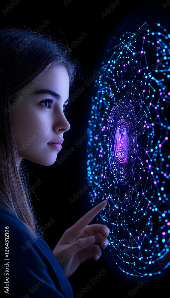 Wall mural woman touching an interactive screen with network display for tech product use generative ai