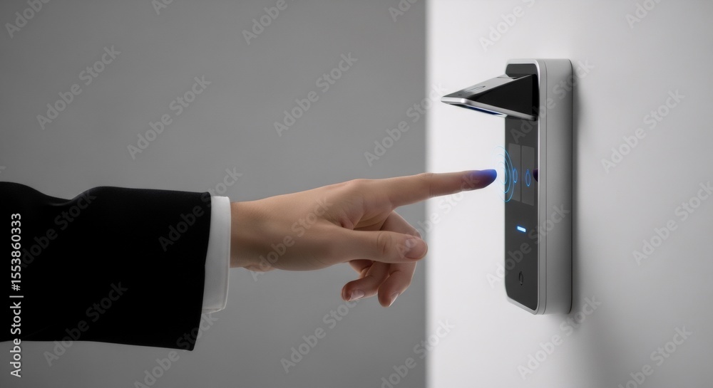 The watermark will not be included on Wall mural.: Woman using biometrics security system for access control - person touch and scan finger on modern de