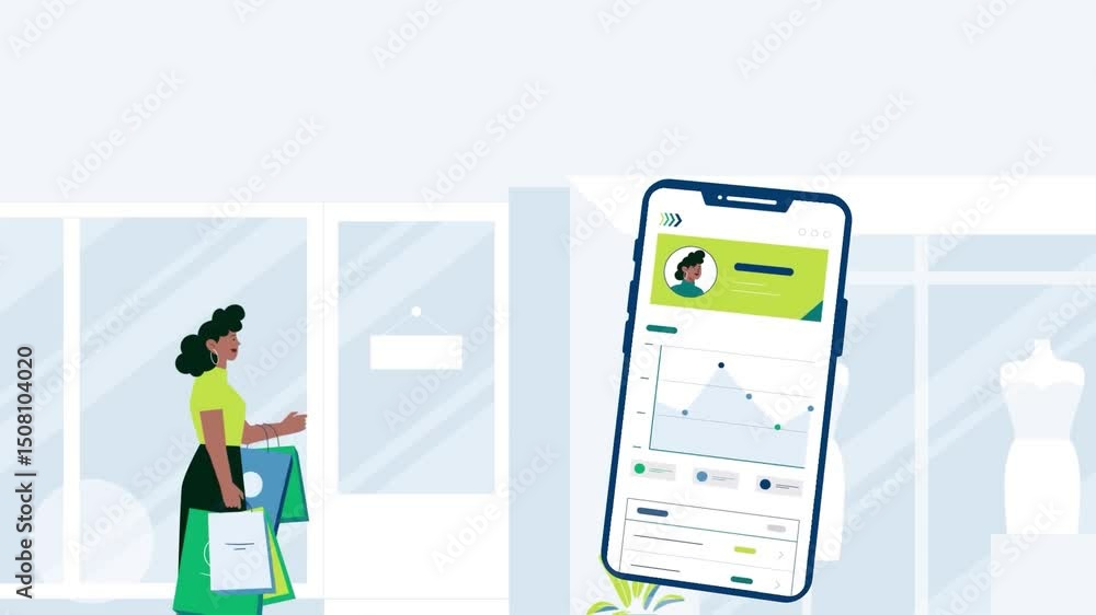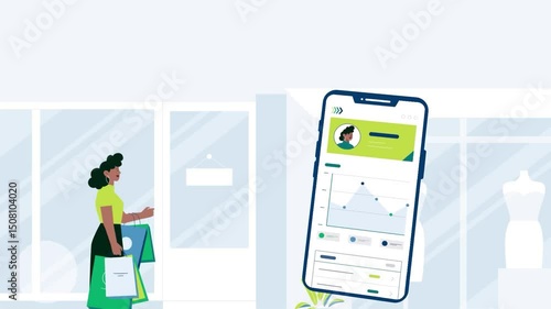 Wall mural woman using mobile app with large digital screen in office window view - Wall murals Wall mural woman using mobile app with large digital screen in office window view - Wall murals