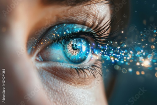 The watermark will not be included on Wall mural.: Woman with blue eye is looking up surrounded by binary code and digital data flow