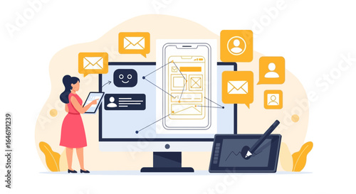 Wall mural woman working on application design using graphic tablet and mobile phone app development process vi