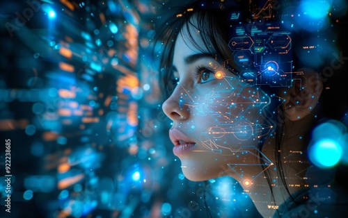 Wall mural woman working with virtual computer. girl using modern computer surfing futuristic metaverse. cyber  - Wall murals Wall mural woman working with virtual computer. girl using modern computer surfing futuristic metaverse. cyber - Wall murals