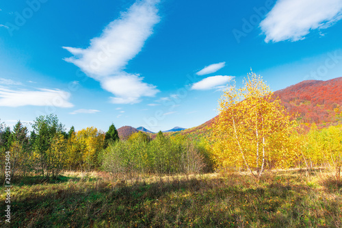 Wall mural wonderful landscape in autumn. birch trees in yellow foliage. distant mountain in fall colors. sunny
