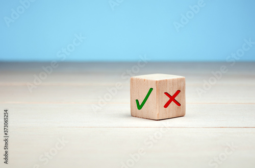 Wall mural wooden block with green check mark and red x. choice and decision making concept.
