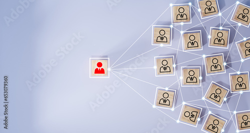 Wall mural wooden cube block print screen person icon which link connection network for organisation structure