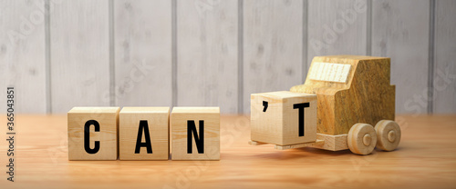 Wall mural wooden forklift is transporting off a cube to alter a message from can't to can - Wall murals Wall mural wooden forklift is transporting off a cube to alter a message from can't to can - Wall murals