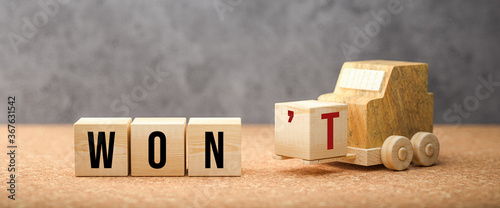 The watermark will not be included on Wall mural.: Wooden forklift is transporting off a cube to alter a message from won't to won on cork surface and