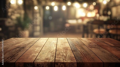 The watermark will not be included on Wall mural.: Wooden table in front of abstract blurred background with bokeh lights