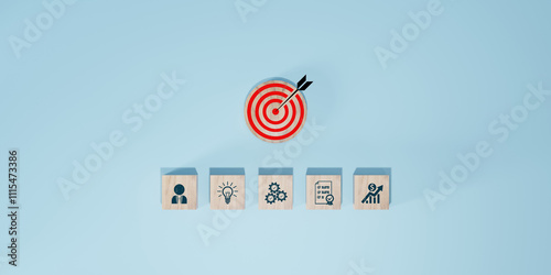 Wall mural woods block step on table with icon action plan, goal and target, success and business target concep - Wall murals Wall mural woods block step on table with icon action plan, goal and target, success and business target concep - Wall murals