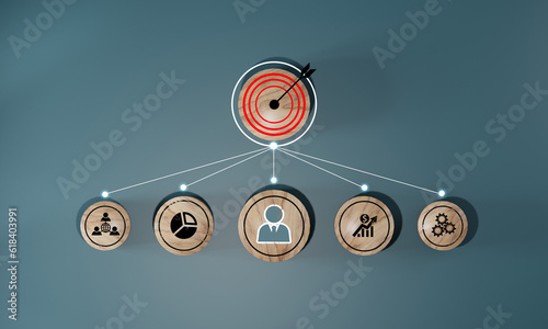Wall mural woods block step on table with icon action plan, goal and target, success and business target concep