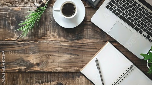 Work from home concept office desk setup with a laptop blank notepad coffee cup and pen on a wooden Wall mural