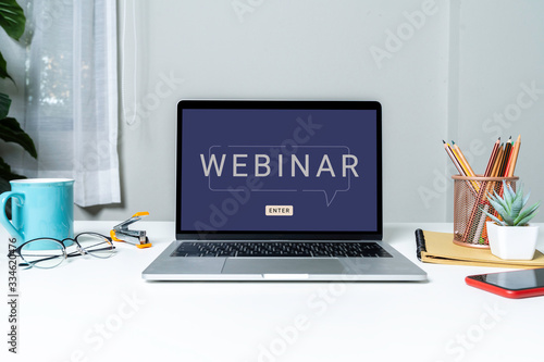 Wall mural : Work from home with laptop computer for online training webinars - e-learning browsing connection and