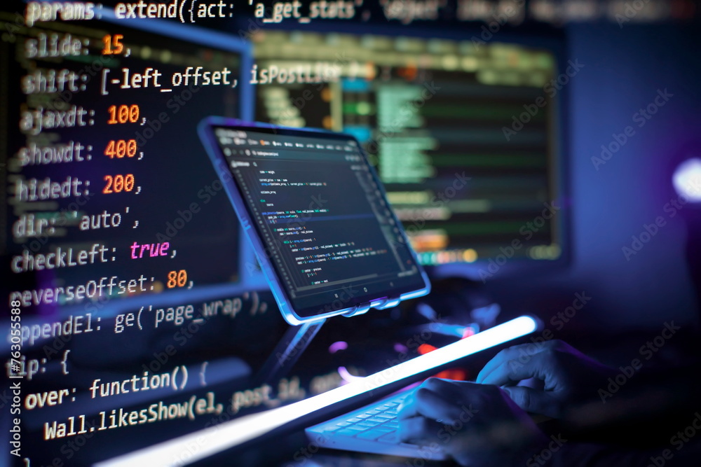 The watermark will not be included on Wall mural.: Working atmosphere of a programmer at home - ?oding html and programming on screen laptop, developme