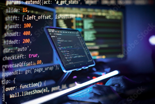 Wall mural working atmosphere of a programmer at home . ?oding html and programming on screen laptop, developme - Wall murals Wall mural working atmosphere of a programmer at home . ?oding html and programming on screen laptop, developme - Wall murals