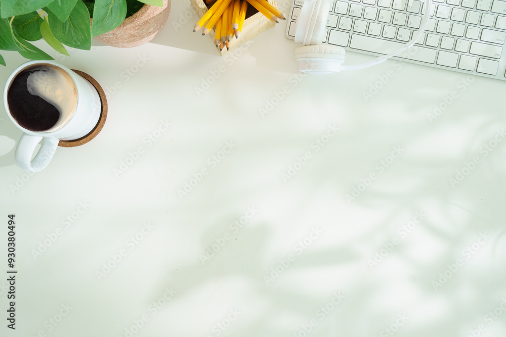 Wall mural working desk with diary, keyboard, coffee cup. top view with copy space for your text. - Wall murals Wall mural working desk with diary, keyboard, coffee cup. top view with copy space for your text. - Wall murals