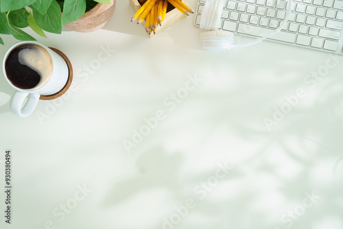 The watermark will not be included on Wall mural.: Working desk with diary, keyboard, coffee cup - top view with copy space for your text -