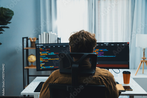 The watermark will not be included on Wall mural.: Working it developer creating online software development information coding on pc screen at back si