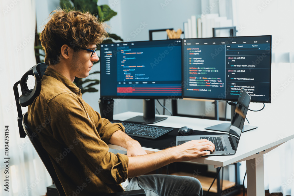 The watermark will not be included on Wall mural.: Working it developer with stressful overworked in creating online software development coding on pc