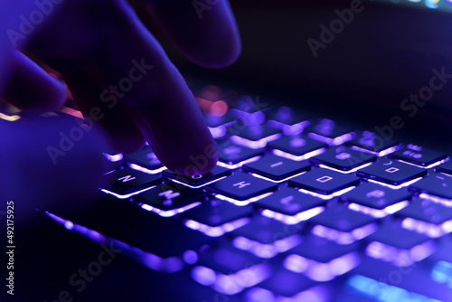 Wall mural working on a neon computer keyboard with colored backlighting. computer video games, hacking, techno