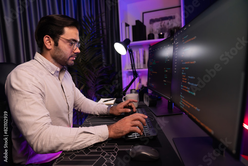 Wall mural : Working smart it developer analyzing data software development on two pc screen, creating applicatio