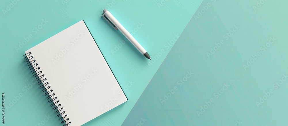 The watermark will not be included on Wall mural.: Workspace mockup on blue background with notebook pen featuring copy space image