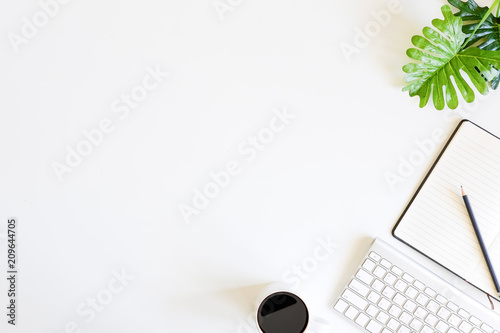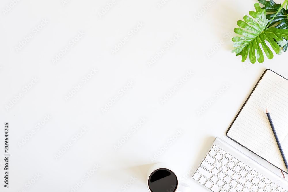 Wall mural workspace topview computer keyboard and coffee with notebook paper on white desk. - Wall murals Wall mural workspace topview computer keyboard and coffee with notebook paper on white desk. - Wall murals
