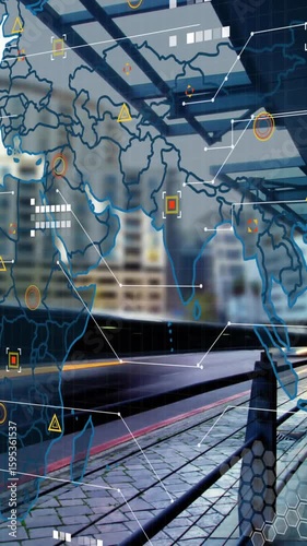 Wall mural world map with data points and network connections animation over urban cityscape - Wall murals Wall mural world map with data points and network connections animation over urban cityscape - Wall murals