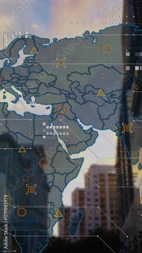 The watermark will not be included on Wall mural.: World map with data processing animation over cityscape at sunset