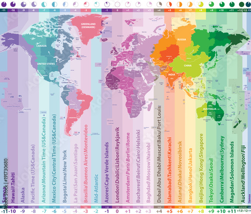 Wall mural world time zones vector map with countries names and borders