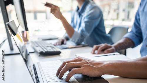 Wall mural : Writing codes and typing data code technology, programmer cooperating working on web site project in