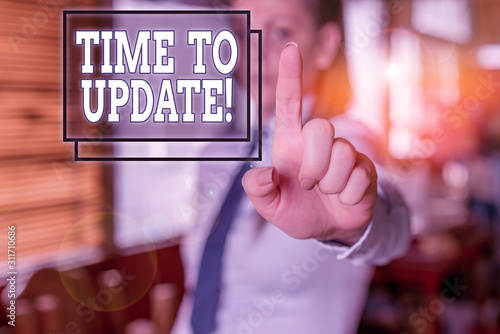 The watermark will not be included on Wall mural.: Writing note showing time to update - business concept for this is right moment to make something mor