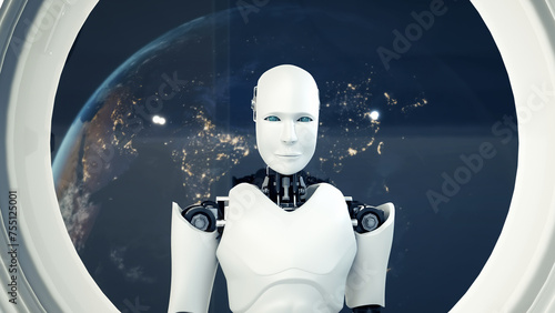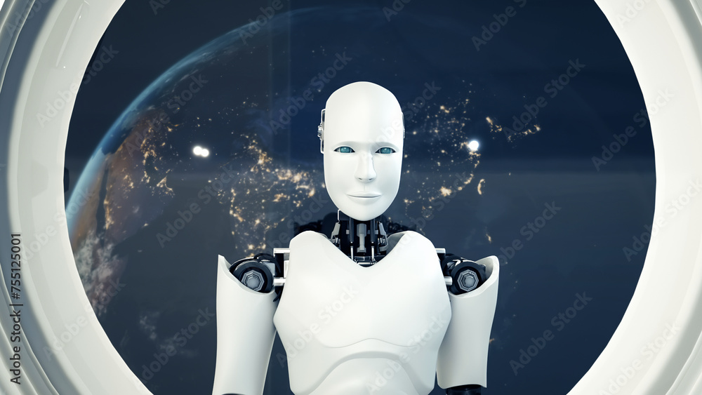 Wall mural xai 3d illustration futuristic robot, artificial intelligence cgi inside spaceship in space universe