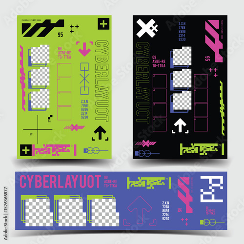 The watermark will not be included on Wall mural.: Y2k 2000s scifi cyberpunk retro-futuristic layout template set dashboard for ux-ui application, 2d v