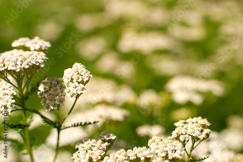 Yarrow blooms in the summer season - macro - flower yarrow ordinary on meadows background - flowers on Wall mural