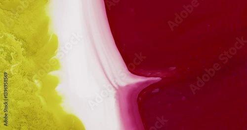Wall mural : Yellow and pink alcohol ink is creating abstract patterns while flowing and mixing on a white backgr