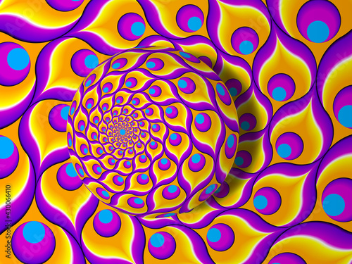 The watermark will not be included on Wall mural.: Yellow background from feathers of peacock with rotating sphere - spin illusion -