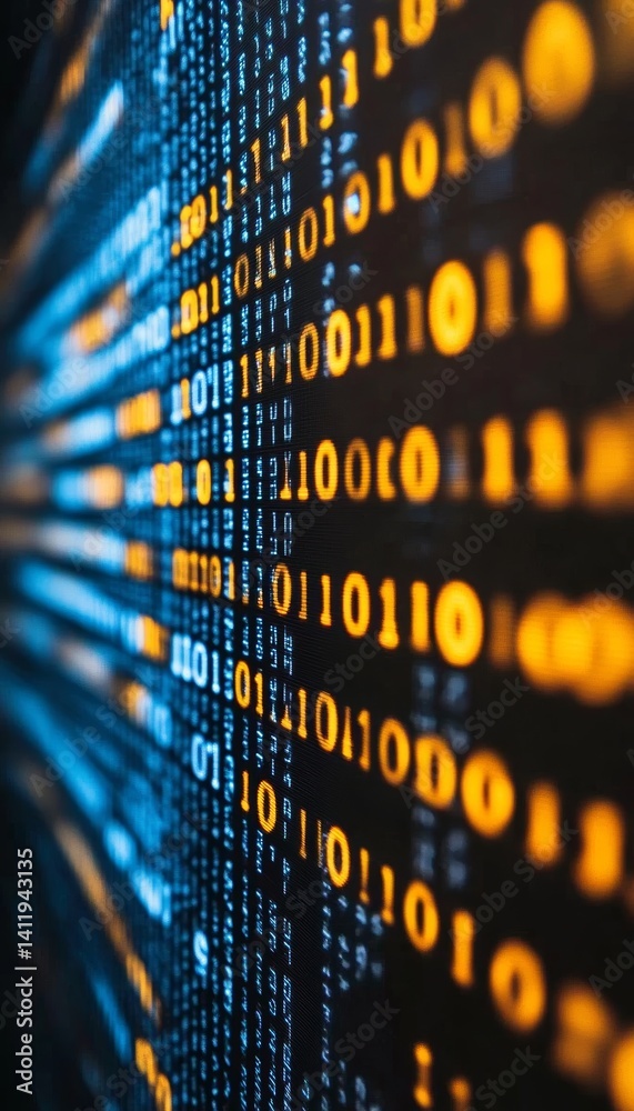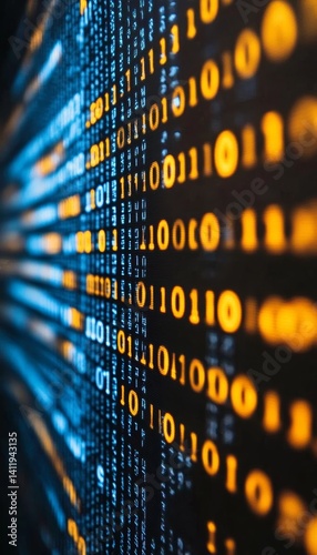 Wall mural yellow digital binary data stream on dark background, abstract technology banner design