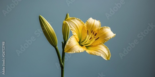 The watermark will not be included on Wall mural.: Yellow lily flower in bloom with closed buds on a soft blue background with copy space for text -