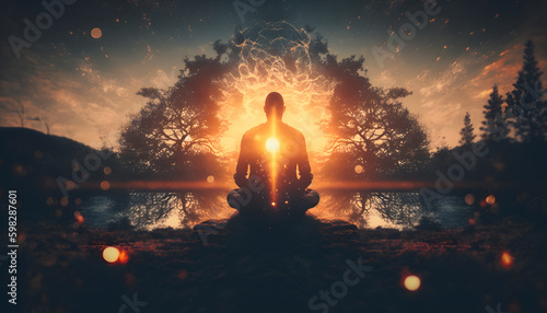 The watermark will not be included on Wall mural.: Yoga silhouette of human in cosmic space meditate with sun light - back view man practicing meditatio