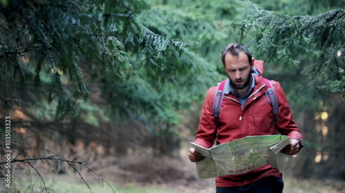 The watermark will not be included on Wall mural.: Young, lost man with a map looking for direction in forest