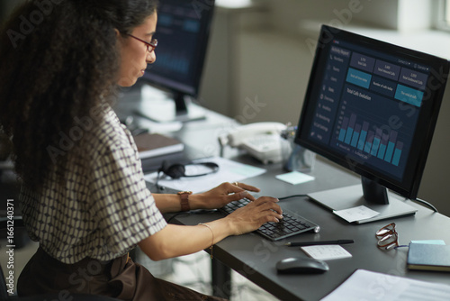 Wall mural : Young adult woman working at desk using desktop computer with data analytics dashboard on screen, ty