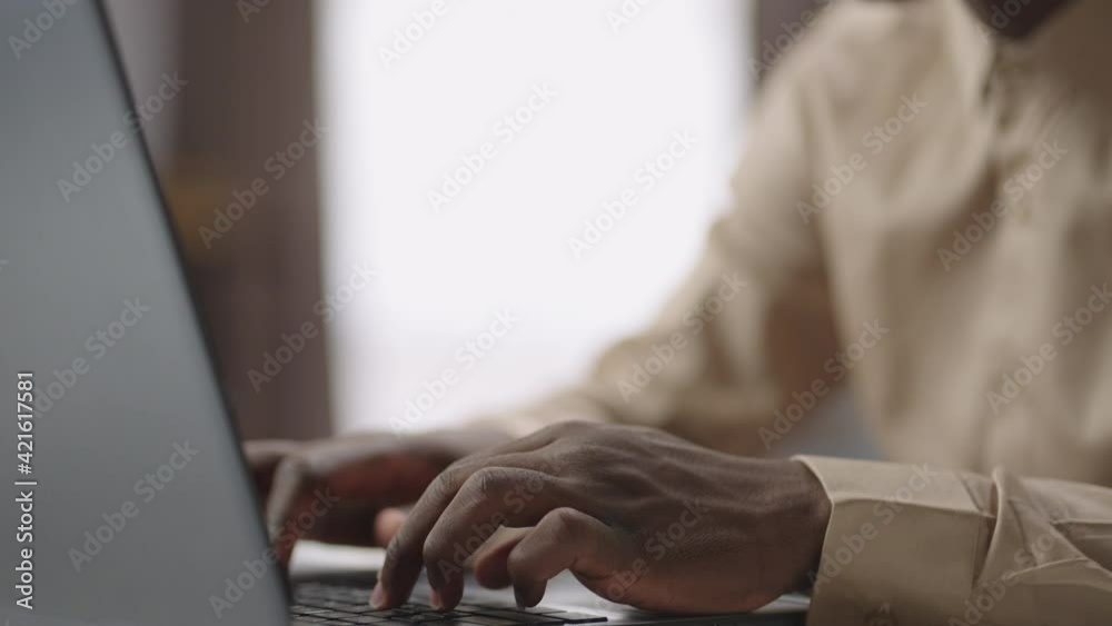 The watermark will not be included on Wall mural.: Young afro-american man is using laptop with internet for working or educating, sending message and