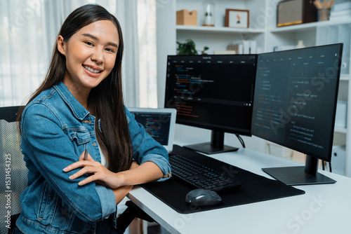 Wall mural : Young asian in it developer looking at camera to present with online information on pc with coding p