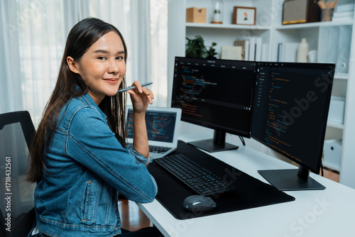 Wall mural : Young asian in it developer looking at camera to present with online information on pc with coding p