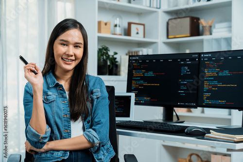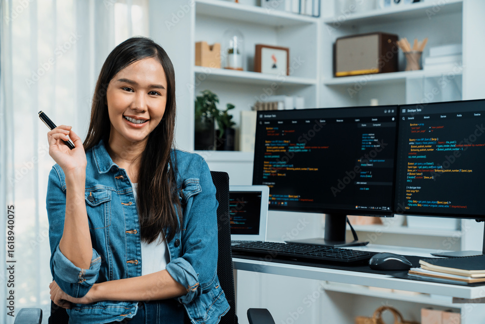 Wall mural : Young asian in it developer looking at camera to present with online information on pc with coding p