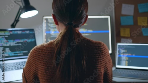 The watermark will not be included on Wall mural.: Young asian woman, developer programmer, software engineer, it support, wearing glasses working hard