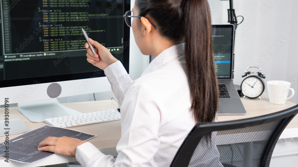 The watermark will not be included on Wall mural.: Young asian woman programmer typing code working with computer at table, coding cyberspace and web d