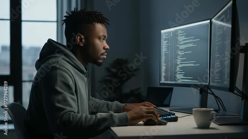 The watermark will not be included on Wall mural.: Young black male programmer focused on coding late at night in a modern office with multiple screens